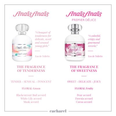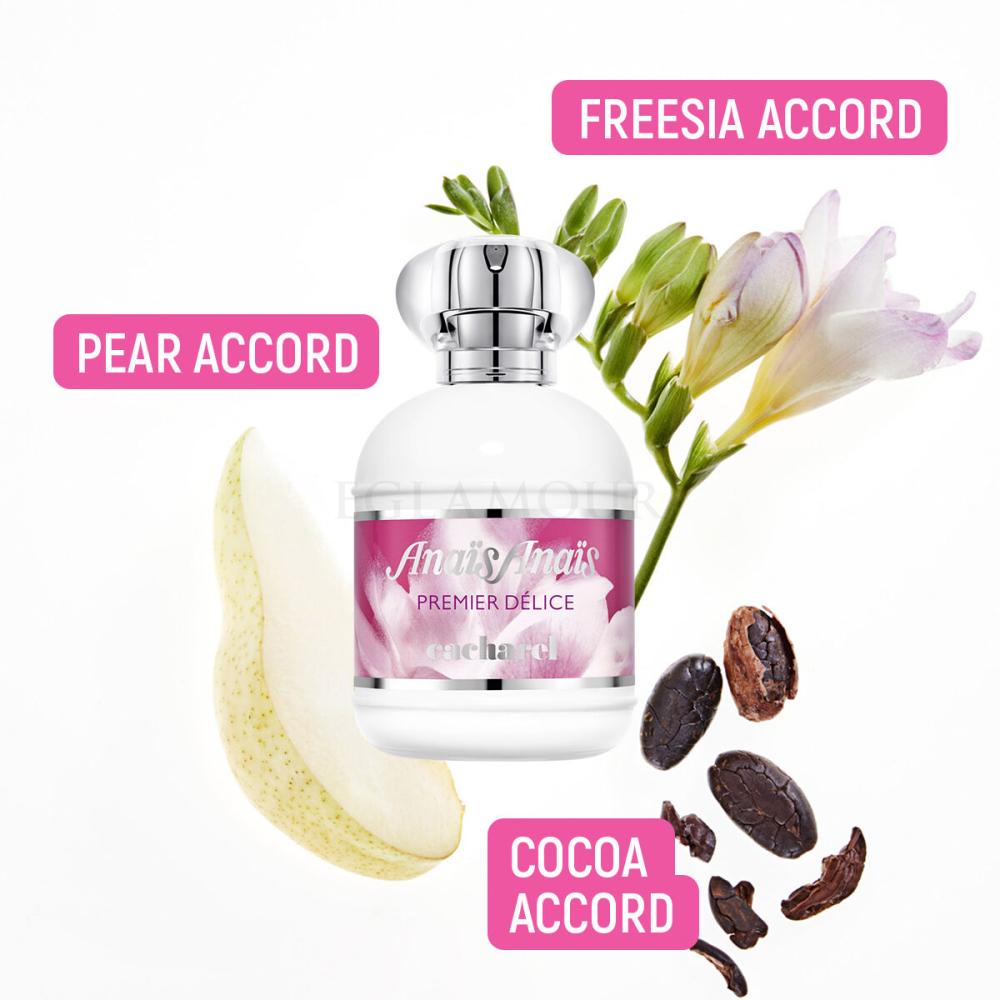 Woda toaletowa Cacharel Anais Anais Premier Delice (2014) składa hołd słynnemu zapachowi Anais Anais (1978) z lilią, hiacyntem, konwalią, kwiatem pomarańczy i jaśminem. Uczyniły tak już zapachy Anais Anais Eau Legere (2006) i Anais Anais Flower Edition (2007), ale dopiero teraz pojawiają się na scenie wykwintne akordy zapachowe z kakao na pierwszym planie. Autorami kompozycji zapachowej Anais Anais Premier Delice są znani perfumiarze Olivier Cresp i Dora Baghriche.