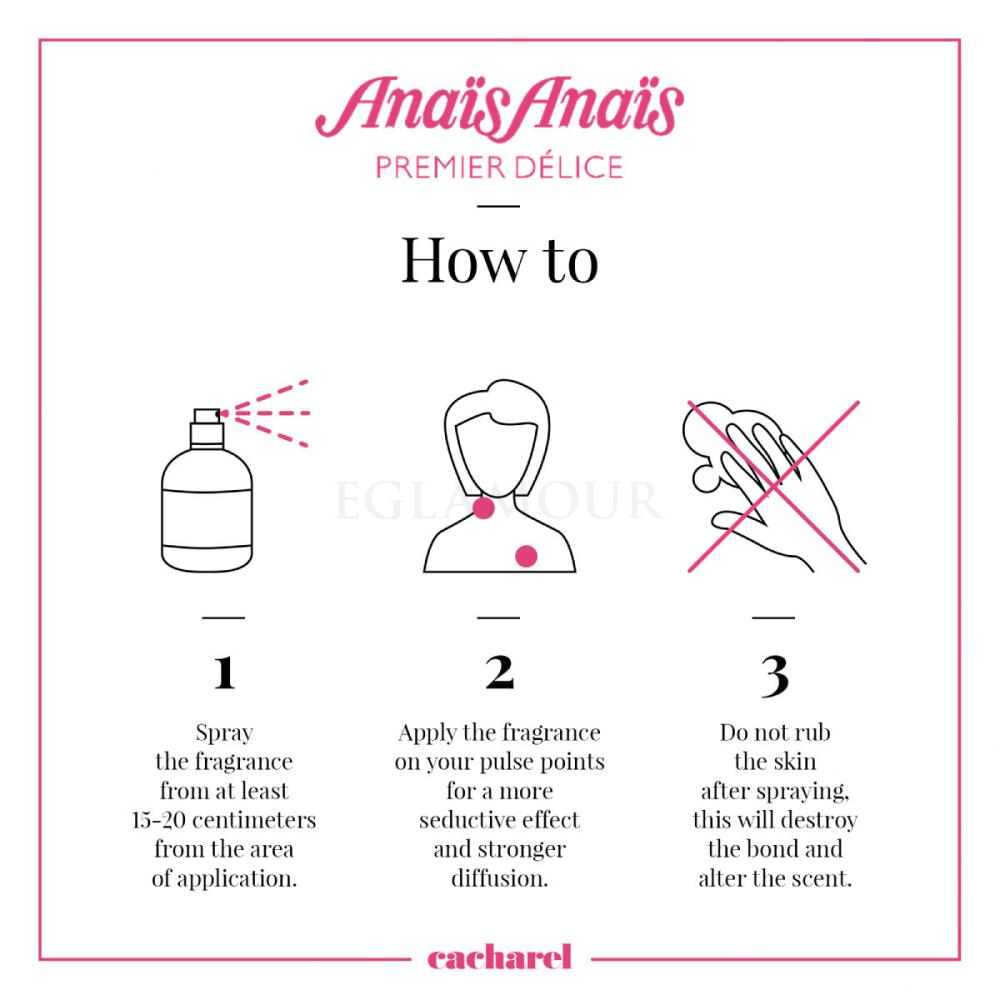 Sięgnij po zapach, który symbolizuje miłość i namiętność! Kremowa, słodka, bogata, przepyszna woda toaletowa Cacharel Anais Anais Premier Delice, zgodnie z aktualnym trendem zapachów dla smakoszy, jest prawie wręcz jadalna... Wspieraj flirt i erotyczny nastrój tym dodatkiem, który jest w każdych okolicznościach triumfem kobiecości i nieokiełznanej ponętności. Różowy płyn zapachowy współgrając z Twoją chemią osobistą, wytworzy na skórze unikalny ślad, który pozwoli Ci wyróżnić się z tłumu. Stosując wodę toaletową, wykorzystaj również nietradycyjne miejsca, takie jak zagłębienia pod kolanami i kostki. Lub wejdź z zamkniętymi oczami w obłoczek zapachu rozpylonego przed Tobą.
