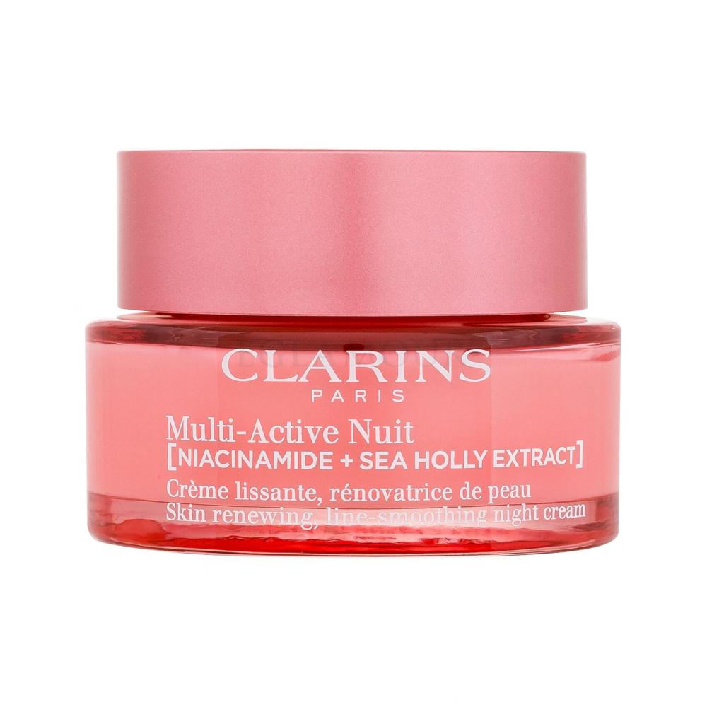 Regenerujący krem na noc Clarins Multi-Active Night Cream Dry Skin zawiera Anti-Pollution Complex, który w trakcie snu chroni cerę przed uszkodzeniami oksydacyjnymi, odpowiedzialnymi za jej przedwczesne starzenie się. Formuła kosmetyku została wzbogacona również o Clarins' Skin Charger Complex, który wzmacnia barierę ochronną skóy oraz pomaga zachować jej młody wygląd.