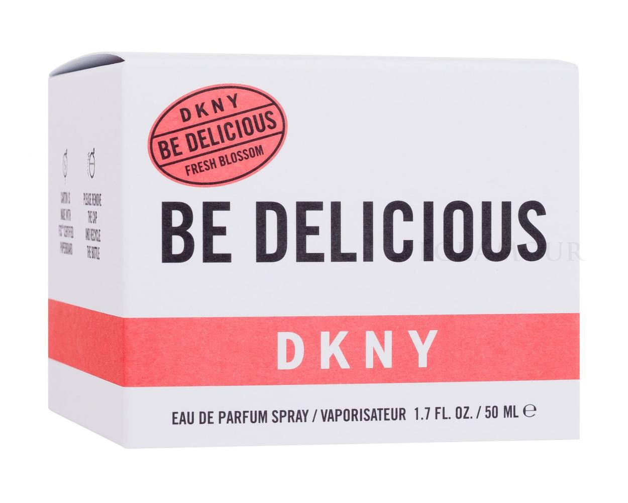 DKNY Be Delicious Fresh Blossom Kompozycja kwiatowo-owocowa, wprowadzona na rynek w 2009roku. Lekka, świeża, soczysta, odpowiednia na letnie dni. Skład: Linia głowy: grejfrut, porzeczka, brzoskwinia, Linia serca: konwalia, róża, jaśmin, Linia podstawy: czerwone jabłko, akordy skórzane.