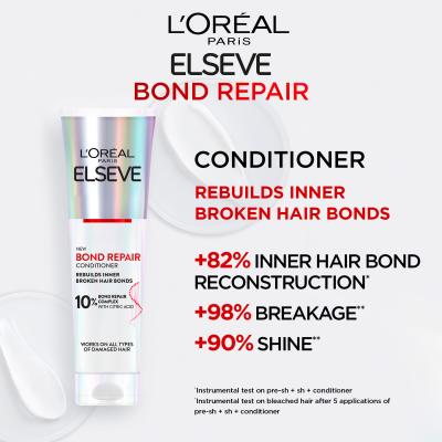 Masz zniszczone i przesuszone włosy? Wypróbuj regenerującą odżywkę L’Oréal Paris Elseve Bond Repair Conditioner, która odbudowuje uszkodzone wiązania wewnątrz włókien włosowych, zauważalnie wzmacniając pasma i znacznie ograniczając ich łamliwość. Ciesz się jedwabiście miękkimi, gładkimi i pełnymi życia włosami z Elseve!