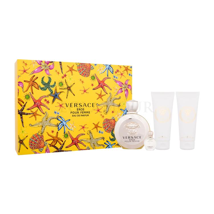 W 2014 roku marka Versace przedstawiła światu wodę perfumowaną Eros Pour Femme, która stanowiła kobiecy odpowiednik popularnego zapachu dla mężczyzn Eros. Nazwa obu kompozycji pochodzi oczywiście od imienia greckiego boga miłości. "Celem kampanii Eros Pour Femme było pokazanie, że i samego Erosa mogła uwieść magia kobiecości. Sile tej nie mogą się oprzeć nawet bogowie" - Donatella Versace. Zapach dedykowany jest eleganckim, zmysłowym i pewnym siebie kobietom. Wyjątkowy charakter Eros Pour Femme doskonale oddaje jego złoty flakon, zdobiony motywem greckiego klucza i meduzy.